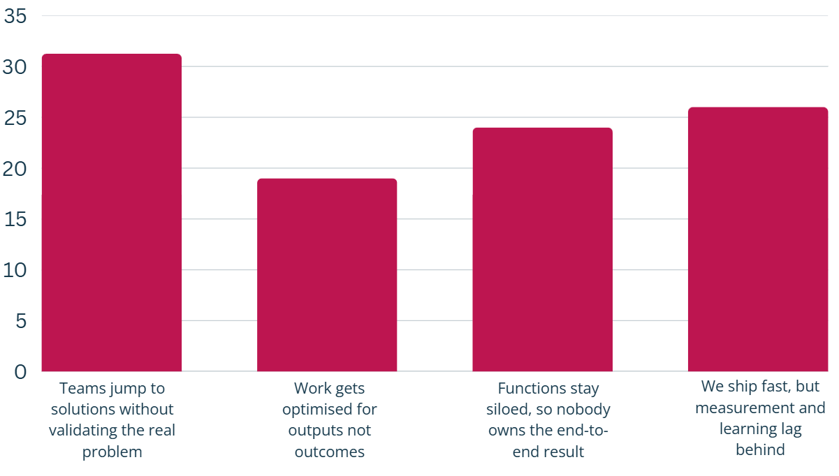 Last week’s poll asked where organisations are most at risk of “perfecting the wrong thing,” and the results show that the biggest problem still sits right at the start of the process. The top answer (31%) was teams jumping to solutions before the real problem is properly understood. Close behind, 26% said they ship quickly, but measurement and learning lag behind, while 24% pointed to siloed functions where nobody really owns the end-to-end result. Only 19% chose output optimisation, though I’d argue that’s often what sits underneath the rest.