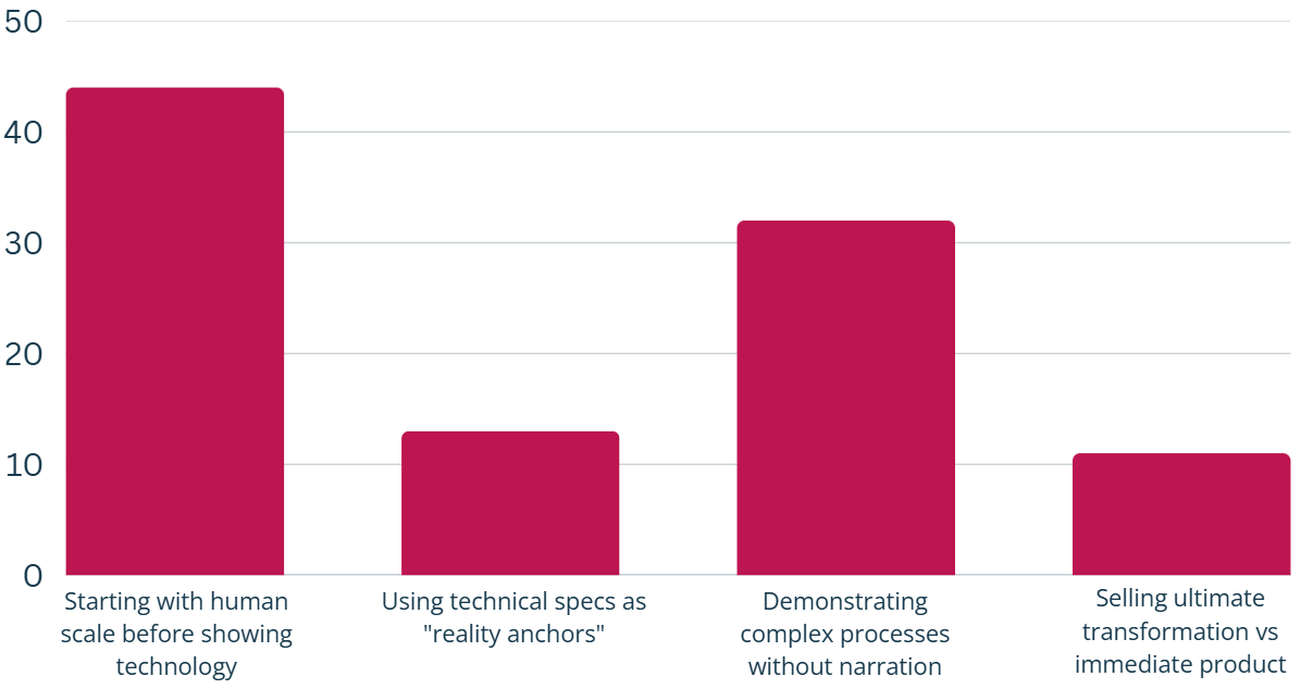 The next biggest challenge (32%) was demonstrating complex processes without narration. That is a different kind of difficulty. It is not about confidence, but clarity. If your product, system, or journey cannot be understood visually or through interaction alone, it often means the experience itself is still too complicated. The smaller responses are still telling. Only 13% chose using technical specs as “reality anchors,” and 11% picked selling the ultimate transformation. My read is that most teams are comfortable talking about features and future vision. The harder part is bridging the gap between the two in a way that feels immediate, intuitive, and grounded in real user value.