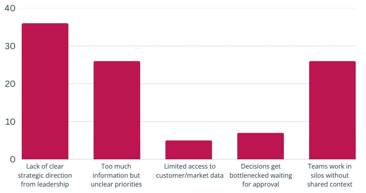 Two answers tied at 26%: too much information but unclear priorities, and teams working in silos without shared context. Those two are closely connected. More data does not automatically lead to better decisions if teams are missing a shared framework for what matters most. And when teams are working from different contexts, they are more likely to interpret the same information in different ways. Only 7% said decisions get bottlenecked waiting for approval, and just 5% pointed to limited access to customer or market data. The main issue is not simply governance or a lack of inputs. In many cases, teams are not waiting because they cannot decide; they are struggling because the criteria for making the decision are not clear enough.